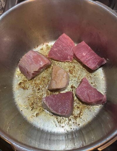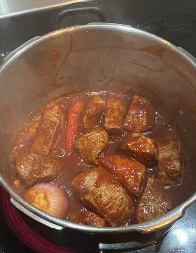 - Add salt and pepper and pressure-cook for 18-20 minutes. (Or slow-cook in regular pot for 1 hour or so, until meat is soft. Add salt and pepper towards the end.)