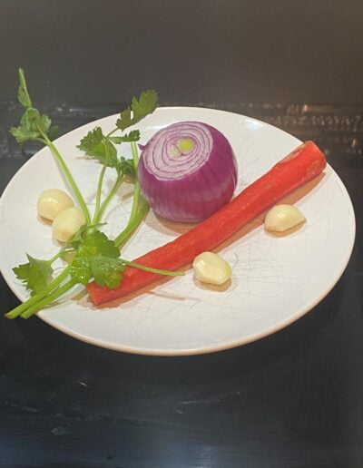 - Add whole onion, parsley, whole carot, whole garlic cloves, 2 tbs olive oil, and stir 2-3 minutes.