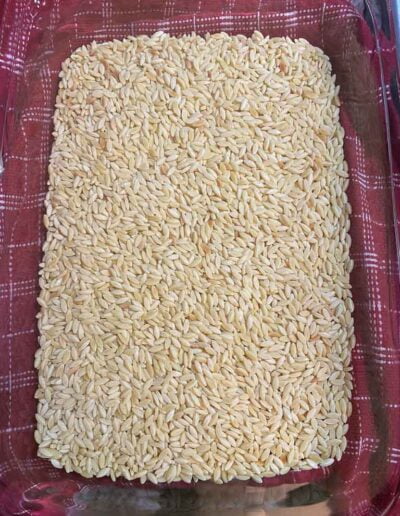 - Warm up olive oil in a pan and add kritharaki pasta stirring well so all grains are oiled. This water-proofs the pasta and helps it stain grainy.